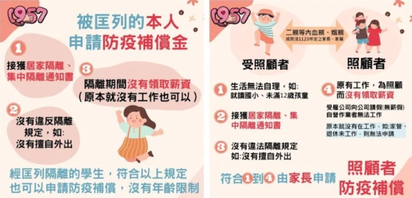 與確診者接觸匡列隔離的防疫補償,分為「本人被匡列隔離的防疫補償金」與「照顧者防疫補償」。(圖/翻攝自衛福部1957福利諮詢專線臉書)