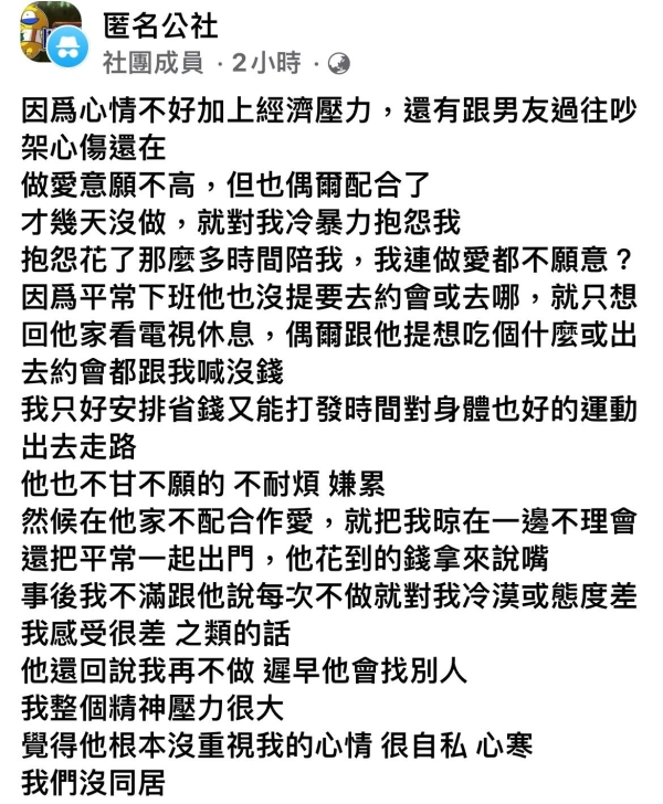 「身邊有個同事男友性無能又愛抱怨男友,跟她說了也離不開,只能說自己選擇自己承擔」