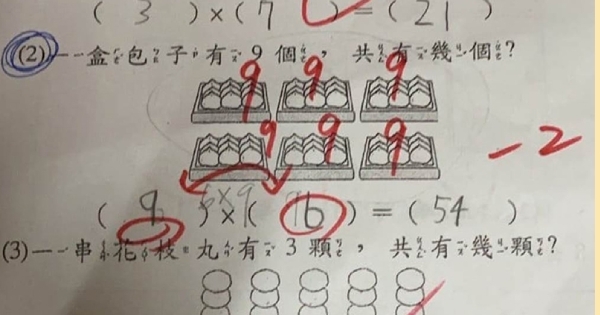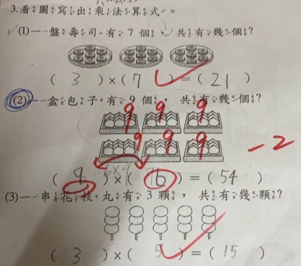 問題表示「一盒包子有9個,共有幾個?」圖上有6盒包子,因此學生寫下答案「6×9=54」,沒想到被老師用紅筆圈起來扣了2分。