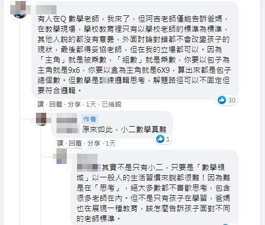 貼文一出立刻引起眾人討論,一名數學老師就跳出來解釋,「因為『主角』是被乘數,『組數』就是乘數,你要以包子為主角就是9×6,你要以盒為主角就是6×9,算出來都是包子總個數」,不過他認為數學主要是訓練邏輯思考,解題路徑可以不固定但要符合邏輯。