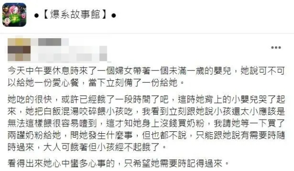 原PO在臉書社團「爆系故事館」發文透露,7日中午店裡準備休息時,有一名媽媽帶著大約未滿1歲的孩子來到店裡,並詢問能否領取愛心餐,老闆也二話不說替她準備一份餐點。