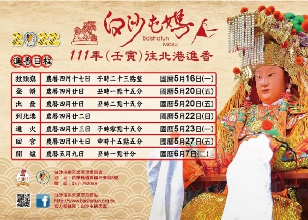 ▲2022年白沙屯媽祖遶境將於5月20日起駕出發。 圖 / 取自白沙屯拱天宮臉書粉絲團
