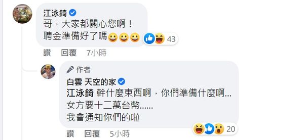 不只如此,白雲事後在自己臉書也回應女星江泳錡,江泳錡興奮問:
