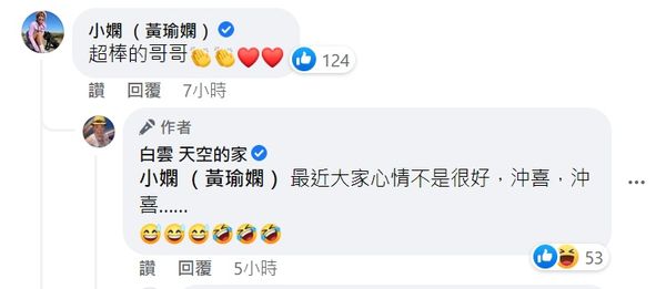 也在留言笑回:「白雲哥的表情怎麼回事?」