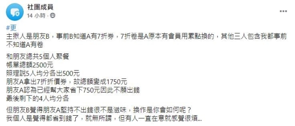 原po在臉書社團「匿名公社」發文說,和朋友共5人一起聚餐,結帳時一名朋友拿出用會員累積點數換來的7折折價券。原本的金額為2500元,打完折後是1750元。這位朋友認為,自己已經幫大家省下750元,因此不願意再出錢,剩下的1750元要由其他4人均分。