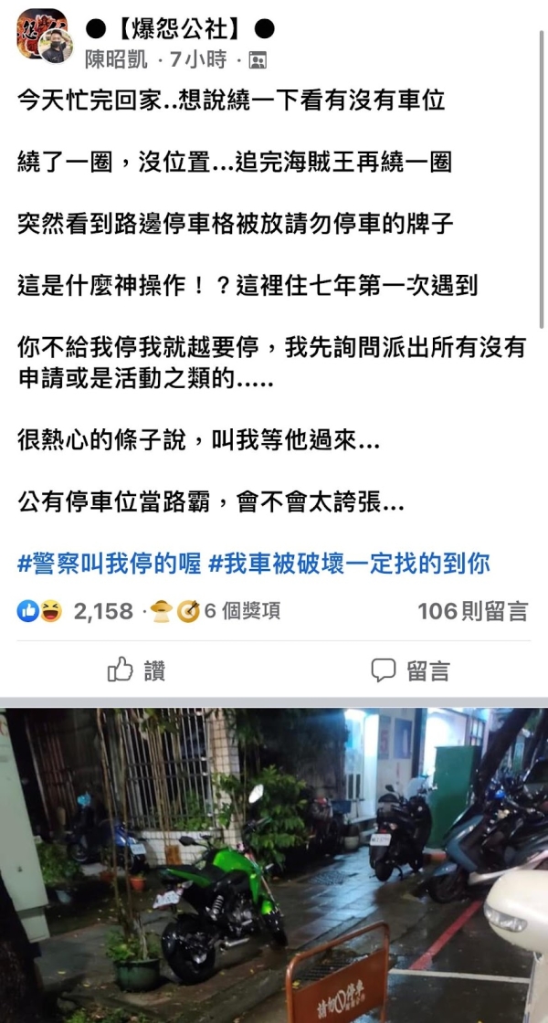 「佔用共有停車格不用付出代價,難怪這麼囂張拿東西佔用,欺負一般人怕停下去被找麻煩就去停別的地方...」