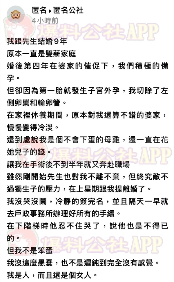 讓我在手術後不到半年就又奔赴職場雖然剛開始先生也對我不離不棄,但終究敵不過獨生子的壓力,在上星期跟我提離婚了。