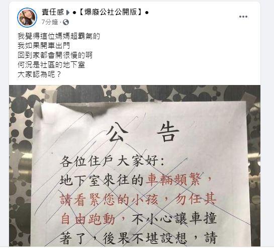 有位網友曾在臉書《爆廢公社》上發文,表示在大樓公告處上看到因為地下室車輛來往頻繁、容易發生意外,希望住戶注意好自家小朋友的紙條後,便發現某位家長直接在下面回嗆,「應該是請有開車的住戶進入地下室開慢一點注意小朋友才對!」,讓既佩服又支持地將這樣霸氣的言論Po上網分享給其他網友看。
