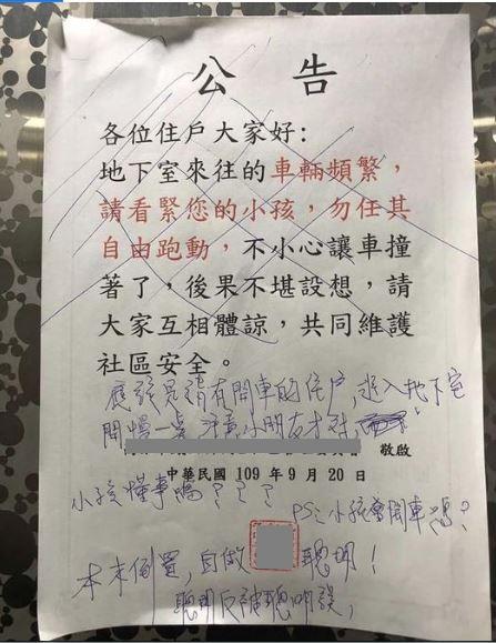 從原PO所分享的照片可以看到,公告原本寫著「各位住戶大家好:地下室來往的車輛頻繁,請看緊您的小孩,勿任其自由跑動,不小心讓車撞著了,後果不堪設想,請大家互相體諒,共同維護社區安全。」而某位家長似乎覺得這樣的公告不妥,便憤怒地直接用藍筆在空白處寫上滿滿的反駁....