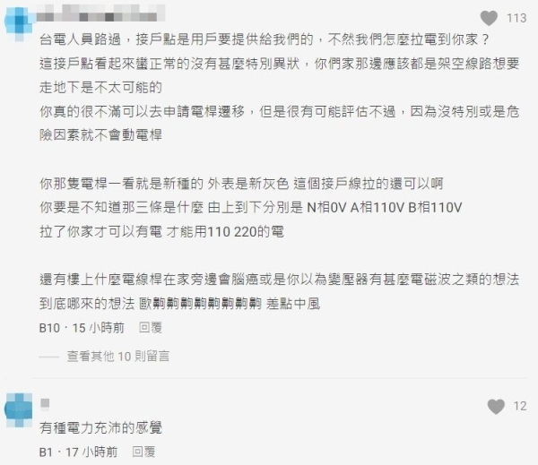 留言串中,一名自稱是台電的網友解釋,「接戶點是用戶要提供給我們的,不然我們怎麼拉電到你家?這接戶點看起來蠻正常的,沒有甚麼特別異狀,你們家那邊應該都是架空線路,想要走地下是不太可能的,你真的很不滿,可以去申請電桿遷移,但是很有可能評估不過,因為沒特別或是危險因素就不會動電桿」。