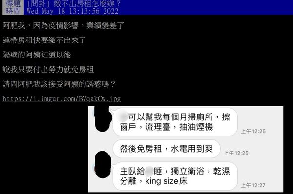 ▲原PO哀號繳不出租金,結果「隔壁阿姨」來交換條件。