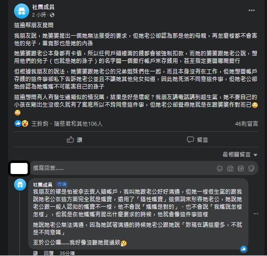 我朋友的確是怕被拿去賣人頭帳戶,我叫她跟老公好好溝通,但她一樣很生氣的跟我說她老公在這方面完全就是媽寶,還用了「隱性媽寶」這個詞來形容她老公,她說她老公跟一般人認知的媽寶不一樣,他不會說「媽媽是對的」、也不會說「我媽說怎樣怎樣」,但就是在他媽媽有提出什麼要求的時候,他就會像這件事這樣