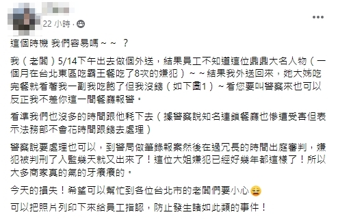 該名老闆在臉書「爆料公社」發文表示,他在台北市東區開店,5月14日下午出去外送,結果店裡遇上「1個月吃8次霸王餐」的嫌犯,但留店員工不知道這位鼎鼎大名人物,因此讓她點餐,結果等老闆外送回來,發現時已來不及,「她大姊吃完餐就看著我一副『我吃飽了但我沒錢,看您要叫警察來也可以反正我不差你這一間餐廳報警』的模樣。」