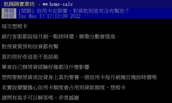 這位網友在PTT的home-sale板上發文表示,「每次想剪卡,銀行客服都說每月刷一點按時還,聯徵分數會提高,對房貸買房、信貸都有幫助,真的很好奇這是不是話術,畢竟自己辦房貸經驗好像都沒什麼影響。」