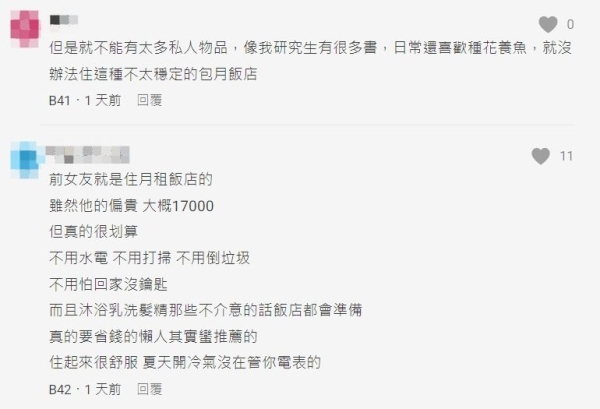 過來人也說出優缺點,「我之前也有問過台北市的飯店,有的有包含打掃呦,只是可能不是每天(有些是一週或是一個月打掃一次),然後通常會有一個地方讓住客丟房間垃圾」、「我現在就是住月租飯店,15000含打掃/1週,含水包電,品質超級不錯」、「的確有朋友這麼做過,不過只住了一年,說是有光線太暗之類的問題」、「前女友就是住月租飯店的,雖然偏貴大概17000元,但真的很划算,不用水電、打掃、倒垃圾,不用怕回家沒鑰匙」。