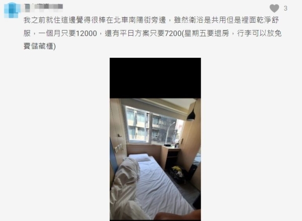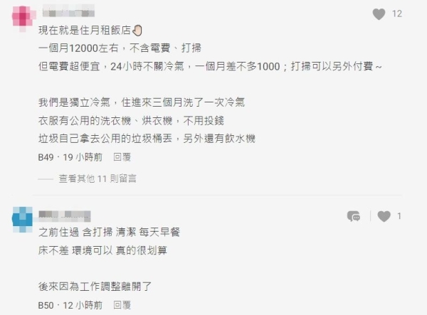 文章貼出後,網友提醒,每間飯店提供服務有差異,「月租飯店沒有包含打掃哦,然後床單什麼的有些還要自己帶,飯店不會提供哦」、「包月有的沒含早餐,因為不確定是否每天都需要,通常是給餐廳折扣,其實我覺得找旅行社去問包月長住才最便宜」、「優點:省水電、冷氣吹到飽;缺點:有訪客會不便畢竟就是住的地方,空間可能不夠大」。