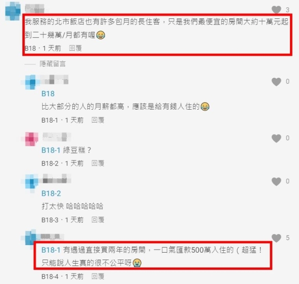 留言串中,一名飯店員工超狂分享,有錢房客砸百萬入住,尤其櫃台還有貼心服務,「我服務的北市飯店也有許多包月的長住客,只是我們最便宜的房間大約十萬元起到二十幾萬/月都有喔...