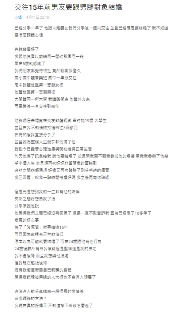 直到國中一年級才正式交往,高中各自讀當地第一志願女校,以及第一志願男校,雖然各處不同學校,但感情仍穩定,後來大學才又讀同一所,而直到畢業後,也就是去年,彼此感情產生裂縫,男友在交友軟體上和19歲女大生曖昧,原Po知情後深受打擊,之後靠著心理治療與藥物維持正常生活。
