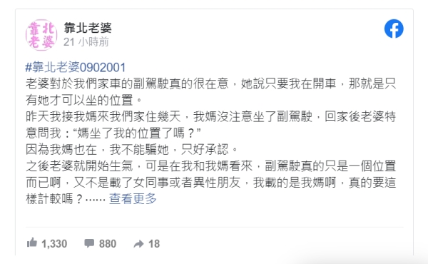 由於當下媽媽就在一旁他只好承認,沒想到老婆卻為了這件芝麻小事現場抓狂…讓他在文章的最後忍不住問廣大的網友:「在我和我媽看來,副駕駛真的只是一個位置而已啊,又不是載了女同事或異性朋友,我載的是我媽啊,真的要這樣計較嗎?」
