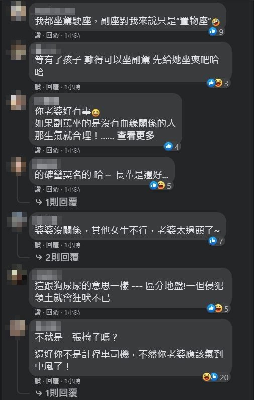 「自家人應該不在副駕駛座的規範內,如果同事朋友我就會很介意了」、「婆婆沒差吧,又不是異性朋友」、「婆婆沒關係,其他女生不行!老婆太過頭了」、「婆婆還好吧,如果是女生朋友或同事,我才會火大」。