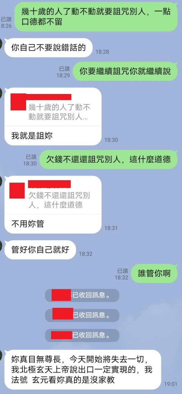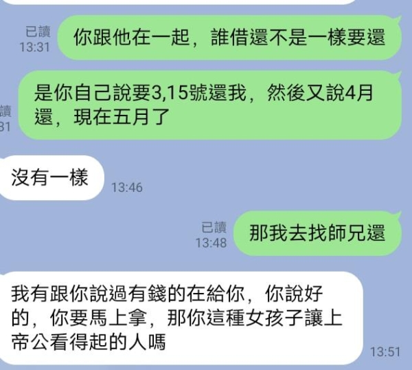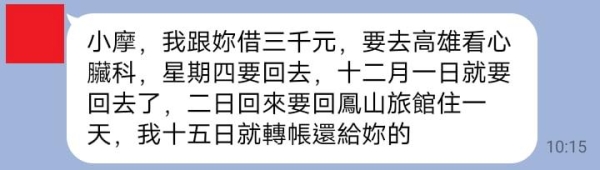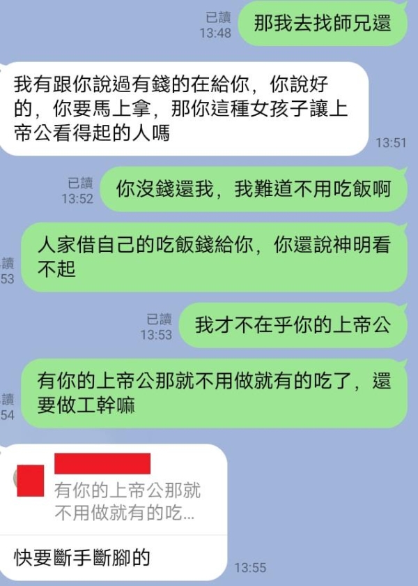 「如果你是被借三千就會影響下一餐沒飯吃的狀況的狀況,就不要借人了。這種我看只能門口灑冥紙辦個法會請九天玄女還是媽祖娘娘降駕來喬了。」