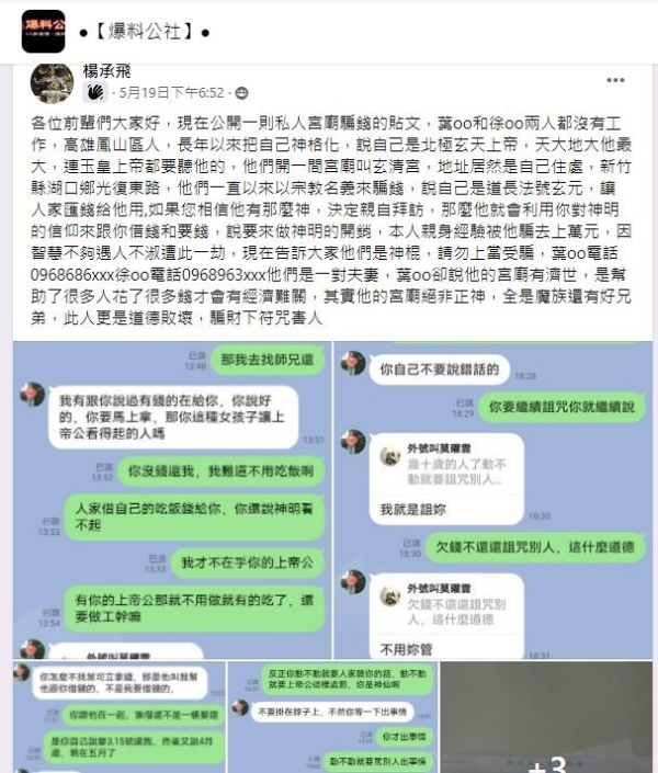 甚至會以「神明開銷」為由,向信眾收取金錢,自己被騙了上萬元,「現在告訴大家他們是神棍,請勿上當受騙」。