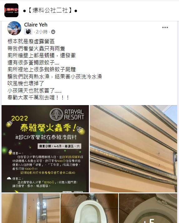 近日有位網友在爆料公社發文『根本就是廢虛露營區!帶我們看螢火蟲只有兩隻,廁所牆壁上都是螞蟻,還發黴,還有很多蒼蠅跟蚊子....