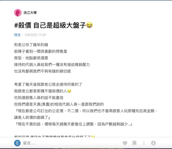網友在Dcard發文「自己是超級大盤子」,指出她跟先生看了這間預售屋得房型地點都很滿意,代銷人員也令人感到親切,加上跟先生本來就不擅長殺價,結果相信代銷業者的「不二價」話術,對方宣稱現在不會抬價再給對方殺價這招了,「如果不買的話,價格每天過幾天都會往上調整,因為戶數越剩越少。」