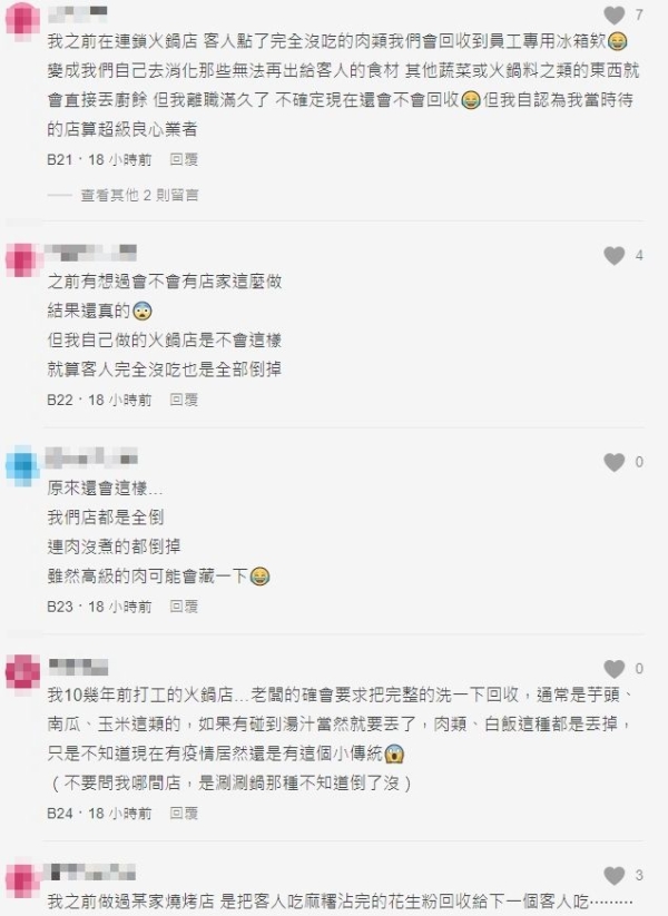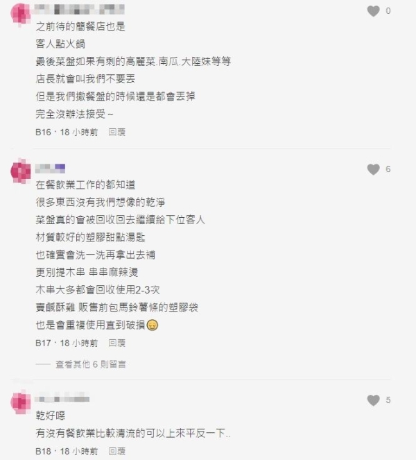 留言串也釣出一票店員搖頭直呼,連知名連鎖店家也淪陷,「朋友待過北部知名連鎖火鍋(但應該是看各分店作法),真的會菜盤回收再利用」、「我16歲打工的火鍋店也是這樣回收客人沒下鍋的食材,金針菇、青江菜好幾桌剩的湊成一把,鳥蛋、酸菜、板豆腐餃類直接移到菜盤,這樣一直重複利用,反正看起來狀態是ok的,直接轉移到新菜盤就對了」、「我之前打工的店會回收甜點的塑膠湯匙,用熱水泡一泡加一點洗碗精繼續用,有夠噁爛」、「做過台北有名的壽喜燒店,也是肉盤菜盤都回收,後來只要朋友說要去吃,我都會去勸他不要」。