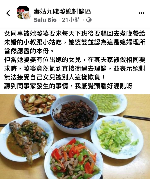 女同事被她婆婆要求每天下班後要趕回去煮晚餐給未婚的小叔跟小姑吃!