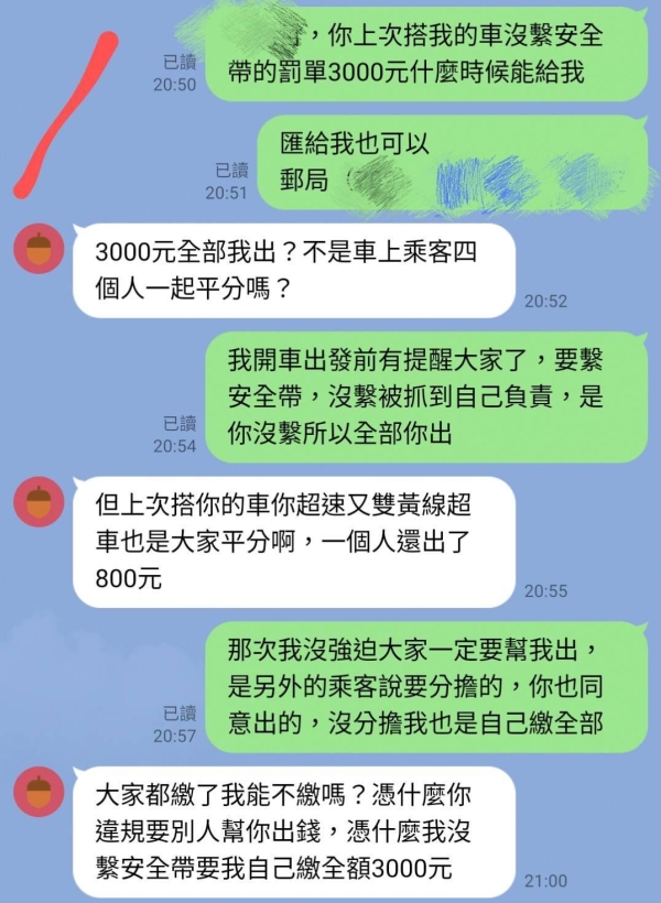 後來我就說不方便的話,用匯的給我也可以,他卻跟我說『罰單可不可以同車的一起平分』?