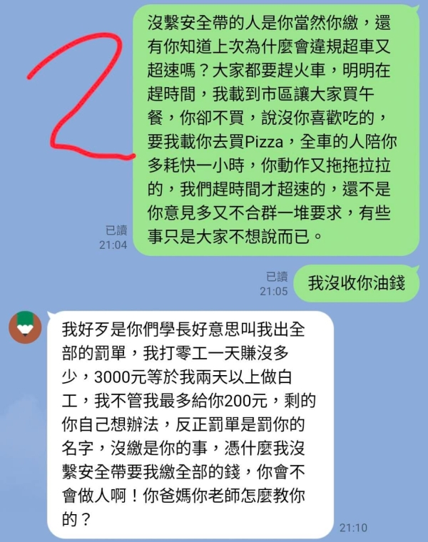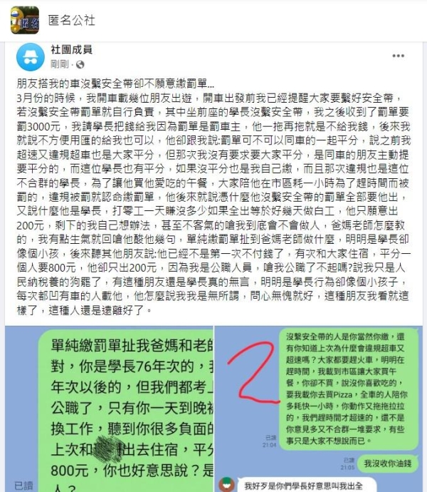 坐副駕未繫安全帶被開罰,卻要求全車一起均分還嗆:我是學長!