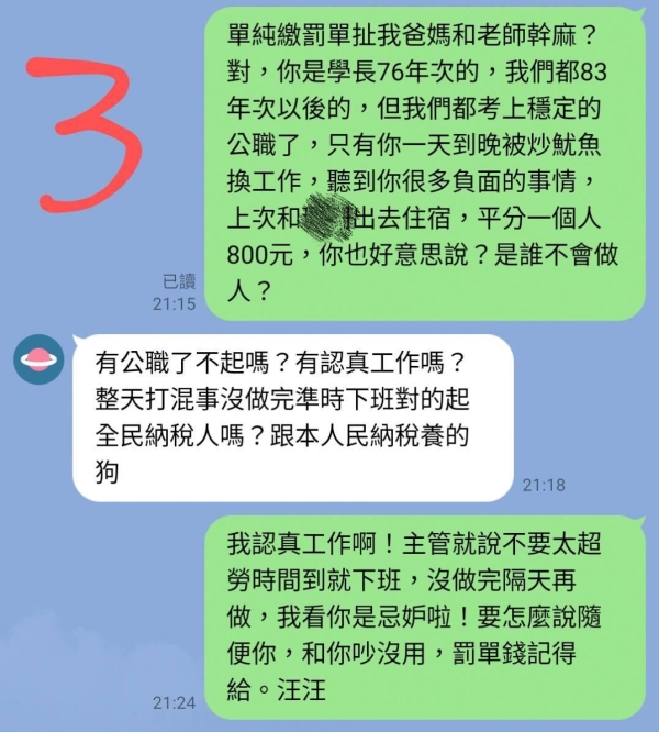 我有點生氣,就回嗆他酸他幾句,單純繳罰單扯到爸媽老師做什麼?