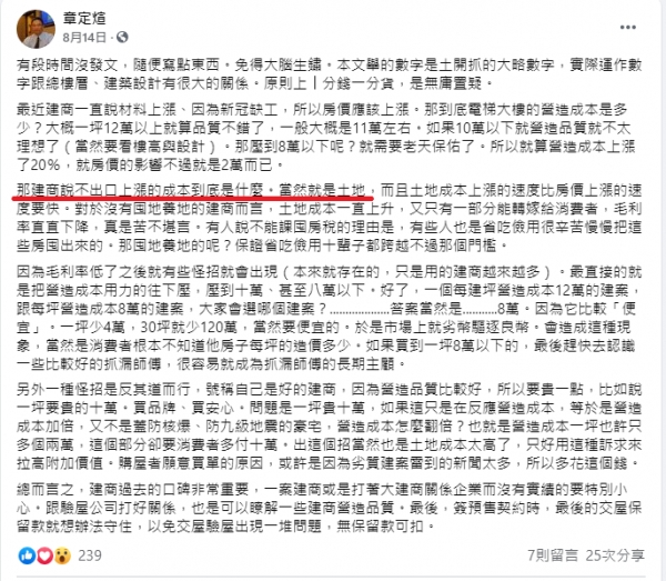 所以房價應該上漲,但說不出口的成本其實是「土地」,