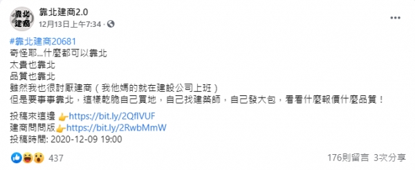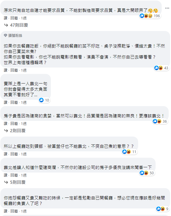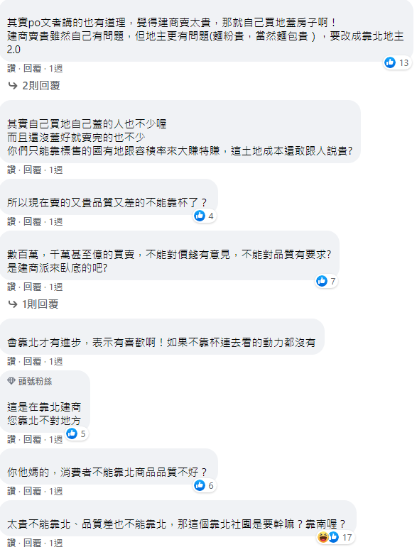 爆氣表示「這樣乾脆自己買地,自己找建築師,自己發大包,看看什麼報價什麼品質!」