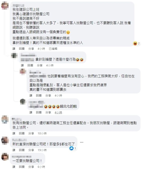該話題也延續到隔日,留言串中,一名內行曝真心話,「我在建設公司上班,我真心建議你找驗屋公司,我不是說建商不好,是現在不懂裝懂的客人太多了,我寧可客人找驗屋公司,也不要聽到客人說『我看網路說、我聽誰說』,重點這些人跟網路沒有一個負責任的,我還遇到客人帶來自以為很專業的親戚,拿針刮牆壁!真的不知道哪裏來這種沒水準的人」。