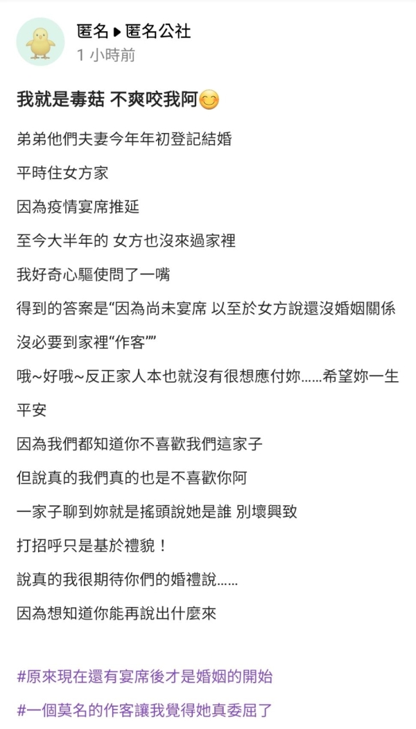 有網友在爆料公社app中的匿名公社,以[我就是毒菇 不爽咬我啊]為標題,發文表示,弟弟和弟妹已經結婚登記半年了,但弟妹卻因還未辦婚宴,而覺得尚未有婚姻關係選擇不到婆家,甚至用了作客的說詞,這讓身為大姑的她頗為不滿。