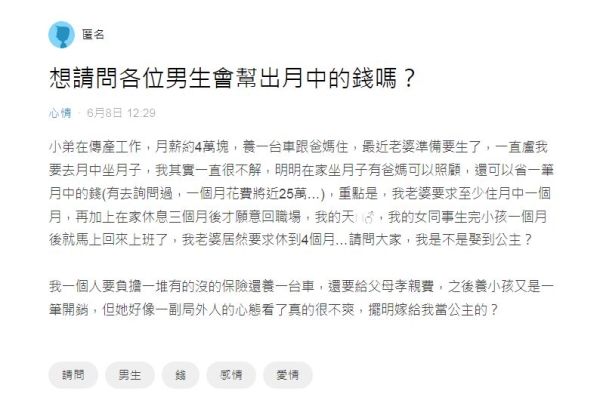 一名準爸爸在Dcard發文表示,他在傳產工作,月薪約4萬元,家裡有養一台車並跟爸媽居住,最近老婆準備要生了,一直盧他要去月子中心坐月子,但他詢問過後發現,月子中心一個月花費將近25萬,讓他不禁抱怨,「明明在家坐月子有爸媽可以照顧,還可以省一筆月中的錢」,不解為何一定要去月子中心。