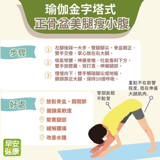 瑜珈中的姿勢「Parsvottanasana」(金字塔式、深度側彎延展式),原意是指「強力伸展的姿勢」,藉由前彎的動作,除了可以幫助身體內側,特別是腿部內側得到伸展!
