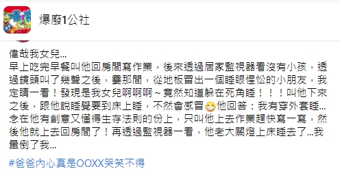 不過因為過去女兒有過一整個晚上玩手機,忘記睡覺的經驗,爸爸前幾天打開鏡頭發現女兒居然不在畫面中,叫了幾聲又沒有反應,心裡發覺是不是發生什麼事情?結果沒幾秒後才知道,原來女兒挪到鏡頭照不到的地方睡著了,這才發現是虛驚一場,也開玩笑直呼:「睡覺要到床上睡!」