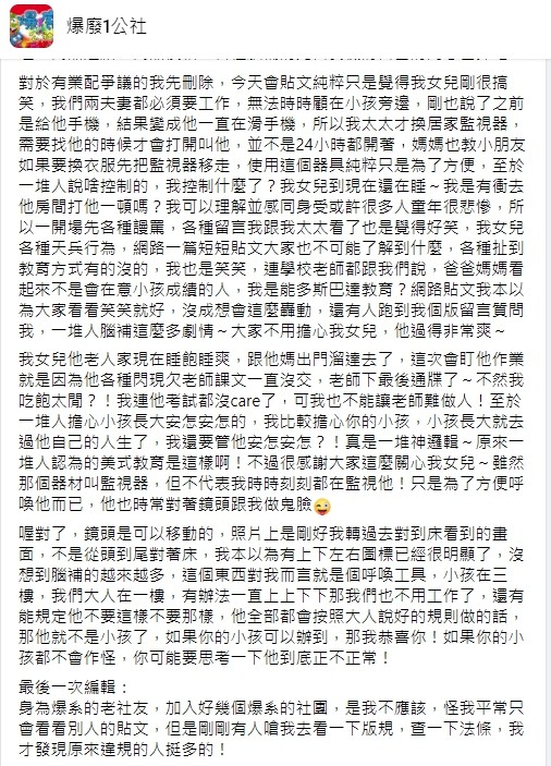 不過也有網友認為:「每家人教養孩子的方式不同,也是不用酸啦!」、「一堆人說8歲夠大了,其實根本沒有,到時候如果出什麼事情,網友是會負責嗎?」、「覺得還好啦,不過如果真的只是要叫孩子,也要注意監視器不是100%安全,要注意駭客問題比較好喔!」