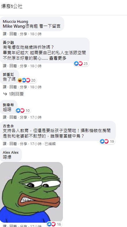 不少網友看到後不以為然,直呼:「有監視器的話,應該永遠學不會自主管理吧?」、「裝監視器有點猛耶,換衣服要怎麼辦?」、「上樓叫一下會怎樣嗎?既然有手機,也有電話跟訊息,這跟監視器有啥關係?」、「要叫人吃點心,明明有各種方式,也可以加裝電話分機,偏偏使用有畫面的監視器,確定不是美化這種說法嗎?」、「又不是嬰兒,裝什麼監視器?隱私全都沒了~真不愧是亞洲父母!」