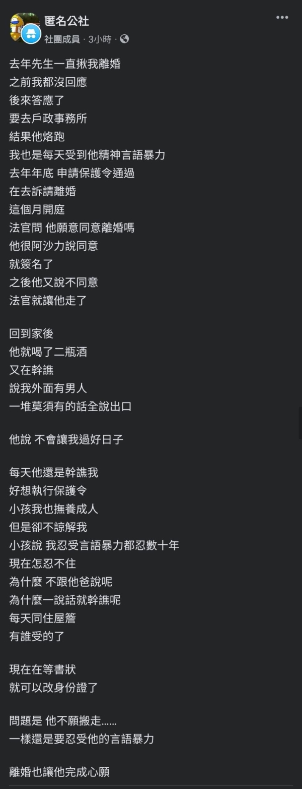 去年先生一直揪我離婚,之前我都沒回應,後來答應了,要去戶政事務所結果他烙跑,我也是每天受到他精神言語暴力...