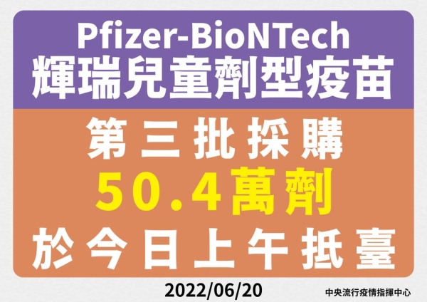 中央流行疫情指揮中心今(20)日表示,今(2022)年第三批採購Pfizer-BioNTech兒童劑型疫苗50.4萬劑,於今日上午抵達桃園國際機場,完成通關程序後,直接運送至指定冷儲物流中心進行後續檢驗封緘作業,再提供給5-11歲兒童接種基礎劑使用。本批效期至今年9月30日,目前共有161.28萬劑到貨,分別為首批5月16日77.76萬劑、第二批5月30日33.12萬劑及本批50.4萬劑。