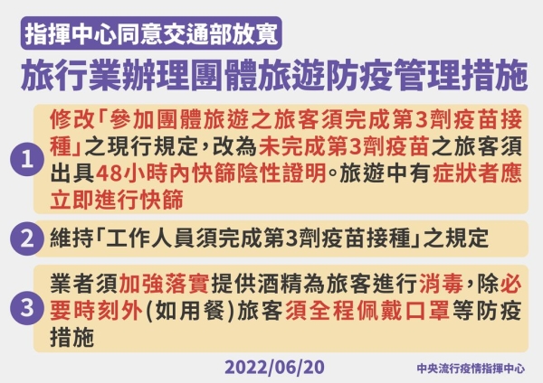 配合中央流行疫情指揮中心宣布放寬旅客參加旅行團須接種第3劑疫苗,未施打3劑疫苗之旅客,可以48小時內之快篩陰性證明代替,交通部觀光局修正「旅行業辦理團體旅遊防疫管理措施」,並自即日起生效。