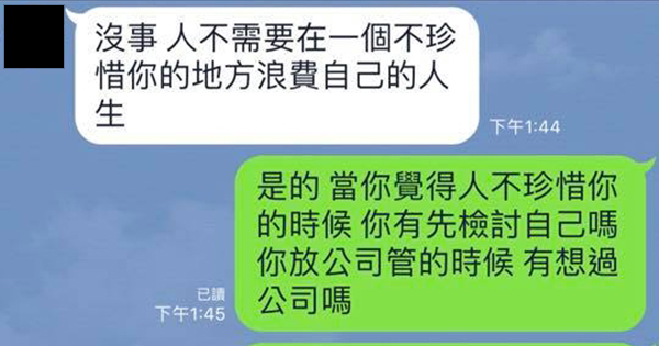 沒想到該員工竟傳訊息質問並要求辭職。
