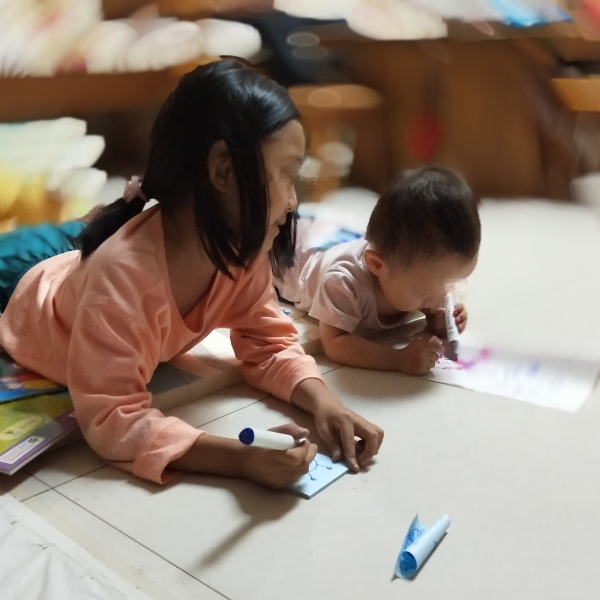 “那你安靜點,不要吵醒媽媽,姐姐帶你去畫畫好不好?”