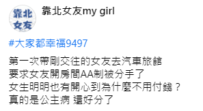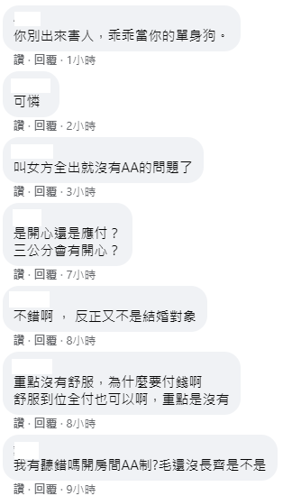 「不要開就免費了」、「你還是去找阿嬤好了」、「有公主病的...是你」、「到底是多會計較,連這個也要AA」、「難道套套錢也要AA制嘛」、「靠~一開始就要說啊..爽完才說AA..」、「不是錢的問題啊啊」、「妳還是乖乖打手X就好,不就沒什麼AA制問題了咩」、「活該你被放生」