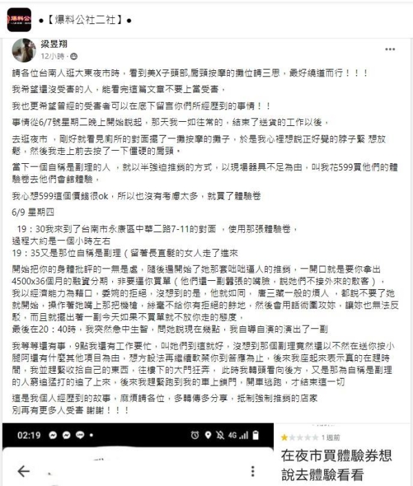 請各位台南人逛大東夜市時,看到美X子頭部、肩頸按摩的攤位,請三思,最好繞道而行!我希望還沒受害的人,能看完這篇文章不要上當受害。我更希望曾經的受害者可以在底下留言你們所經歷到的事情!