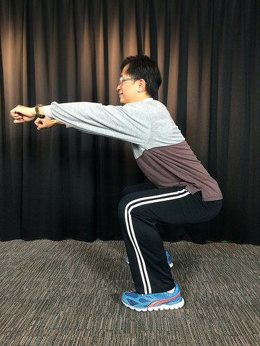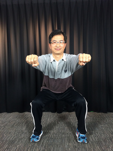 切記,大腿和地面平行這一點很重要,因為如果再蹲下去,就容易讓膝蓋受傷,老人家軟骨和韌帶較脆弱,比較不適合平蹲,可以「半蹲」,就是小時候不聽話,被老師罰的那一種,比較輕鬆。如果年輕人平時缺乏運動,沒力氣蹲到大腿和地面平行,也是從半蹲開始,配合拉筋,慢慢愈蹲愈低,最後就可以做到平蹲,整個下半身的靈活度也會大幅提升。